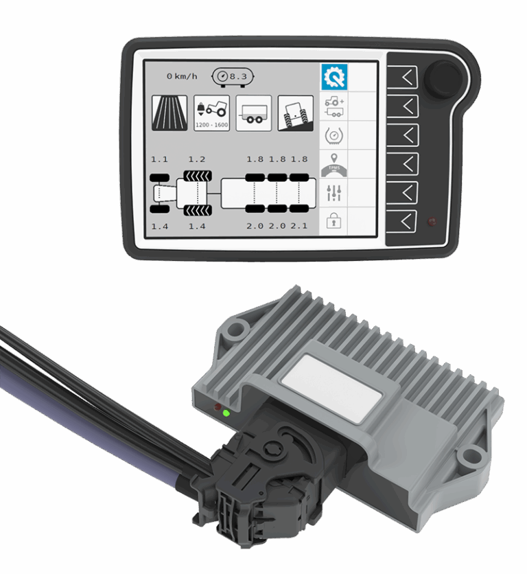 The QTIS ISOBUS software is designed for ease of use, safety, and fuel efficiency. It manages not only tyre pressure adjustments, but also alerts for leaking or overheating tyres. Prevent tyre bead unseating on slopes by increasing the pressure in the lower-positioned tyres, and monitor the quality of the compressor oil. The ECU is connected to a wiring harness for quick and error-free installation.