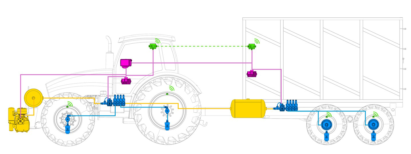The ECU can autonomously perform all tasks, including compressed air conditioning and setting the tyre pressures. Vehicles are interconnected via the ISOBUS connector to the in-cab display (VT – Virtual Terminal). Tyre pressure is monitored by modified TPMS sensors, which wirelessly transmit the tyre pressure to the TPMS receiver (optionally via a TPMS repeater). The receiver forwards the values to the ECU on the vehicle via the CAN J1939 protocol.